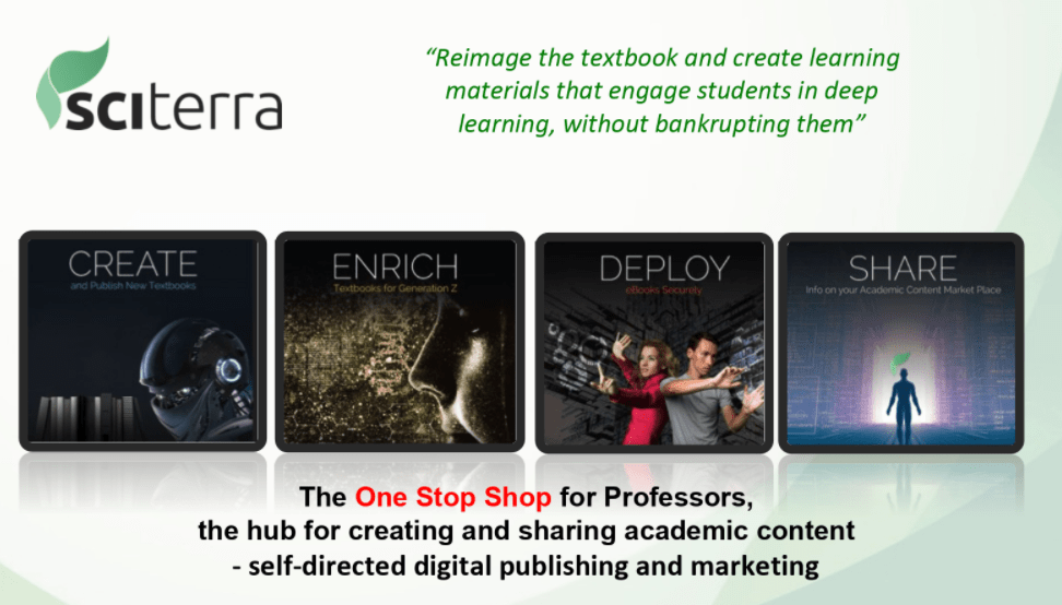 Sciterra is a long overdue online marketplace designed to streamline the gathering and sharing of learning content. Academics, teachers, indeed anyone who writes and publishes now has an opportunity to promote their textbooks on Sciterra. Sciterra is an easy to use academic content marketplace for content marketing and distribution. It also provides all the tools needed for content creators to create, customize, publish, promote, sell, share and distribute to professors and students.