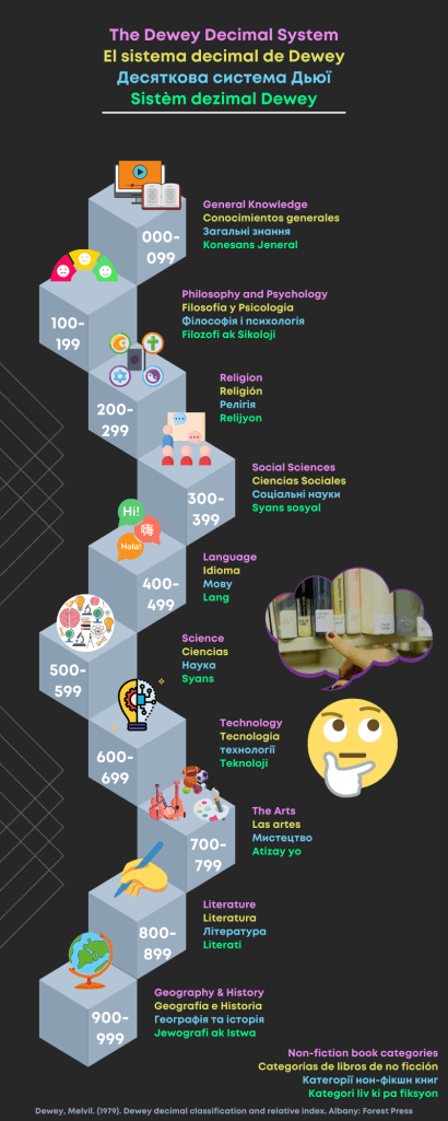 The Dewey Decimal System in English, Spanish, Ukrainian and Haitian Creole.