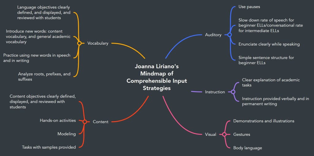 For a Discussion Board in EDDN 637 EDDN 637 Second Language Learners and the Content Areas the weekly contribution was constructing a mindmap of comprehensible input strategies and connecting the input strategies to teaching strategies. As their Professor, there is much pride to see such excellent work by my candidates.
