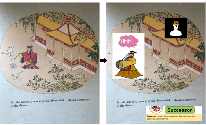 As far as the text goes, I would add Chinese translation on each page to promote greater understanding for ELLs with Chinese background. This text can be used to reinforce understanding of emotions, and even though illustrations of character’s emotions mostly match the text, readers would have to look closely at the expressions on the characters’ faces. For this reason, I would make illustrations bigger so the character’s emotions are much more visible. I would also make an emphasis on the words that help to highlight the main character’s persistence and convey the lesson in the story. I would make the advanced words stand out by making them bold, in a different color, and using a bigger font. I would also add insets with definitions and visuals on some pages of the book to help ELLs understand the meaning of advanced words like tend and successor among other words. See below.