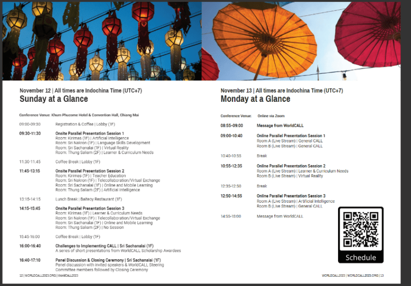 I look forward to being a session chair and presenter on the topic of Empowering Educators for the 21st Century: Discovering the Potential of Immersive Technologies and AI for Simulation Training at the WorldCALL2023 conference, A CALL in Critical Times November 09-13, 2023 | Held in Chiang Mai, Thailand (and online) Welcome to The 6th WorldCALL Conference (WorldCALL2023), held in partnership with The International Academic Forum (IAFOR), and in association with the Computer Assisted Language Instruction Consortium (CALICO), Confédération Européenne des Centres de Langues de l’Enseignement Supérieur (CercleS), the European Association for Computer-Assisted Language Learning (EUROCALL), the International Association for Language Learning Technology (IALLT), the Korea Association of Multimedia-Assisted Language Learning (KAMALL), and the Japan Association for Language Education and Technology (JLET).