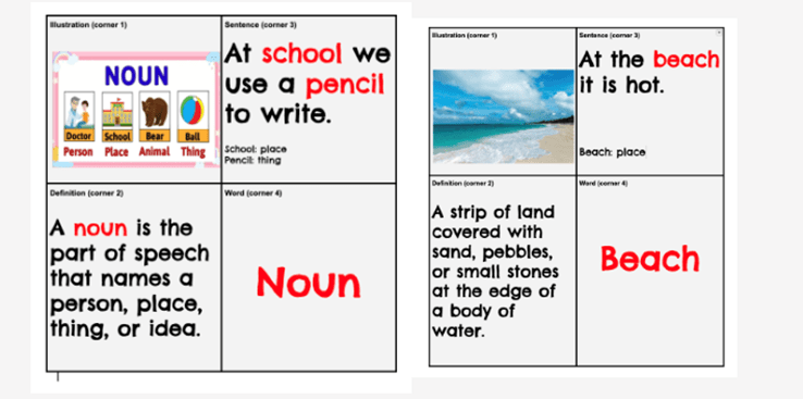 This week, I used the “four corners vocabulary charts” as an activity to learn about nouns. I gave my students directions for choosing a corner and then discussed the card in that corner with one partner. I showed them how to complete the activity by using the first image below of the vocabulary word “noun,” then we continued this activity but with five different nouns, such as the image of the word beach below. This helped all students, specifically ELLs, because I noticed they were listening to their peers, and some students were working hard to help their friends learn about nouns. I enjoyed using this activity because students loved walking around the room, allowing them to look at vocabulary differently. The multiple ways of representing nouns helped them clarify the differences between the types of nouns.