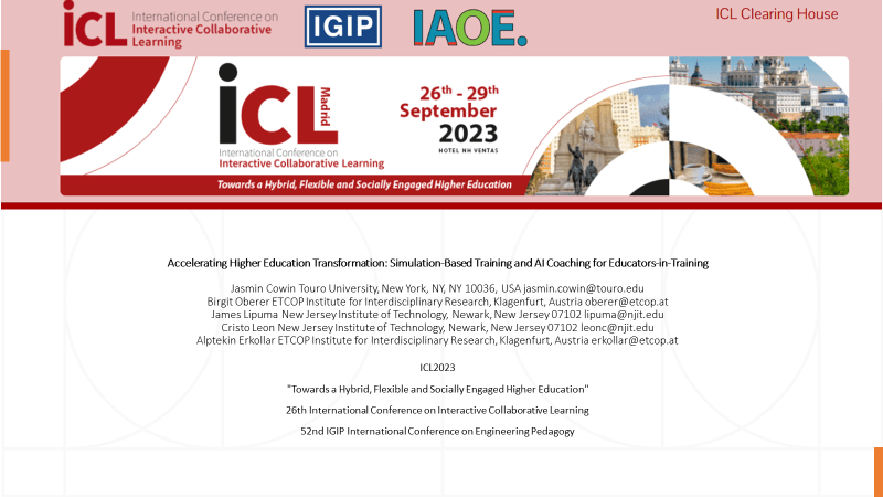 Cowin, J., Oberer, B., Lipuma, J., Leon, C., & Erkollar, A. (2023). Accelerating Higher Education Transformation: Simulation-Based Training and AI Coaching for Educators-in-Training. (Virtual Presentation, Sept. 27, 2023). 26th International Conference on Interactive Collaborative Learning and 52nd IGIP International Conference on Engineering Pedagogy (ICL2023)